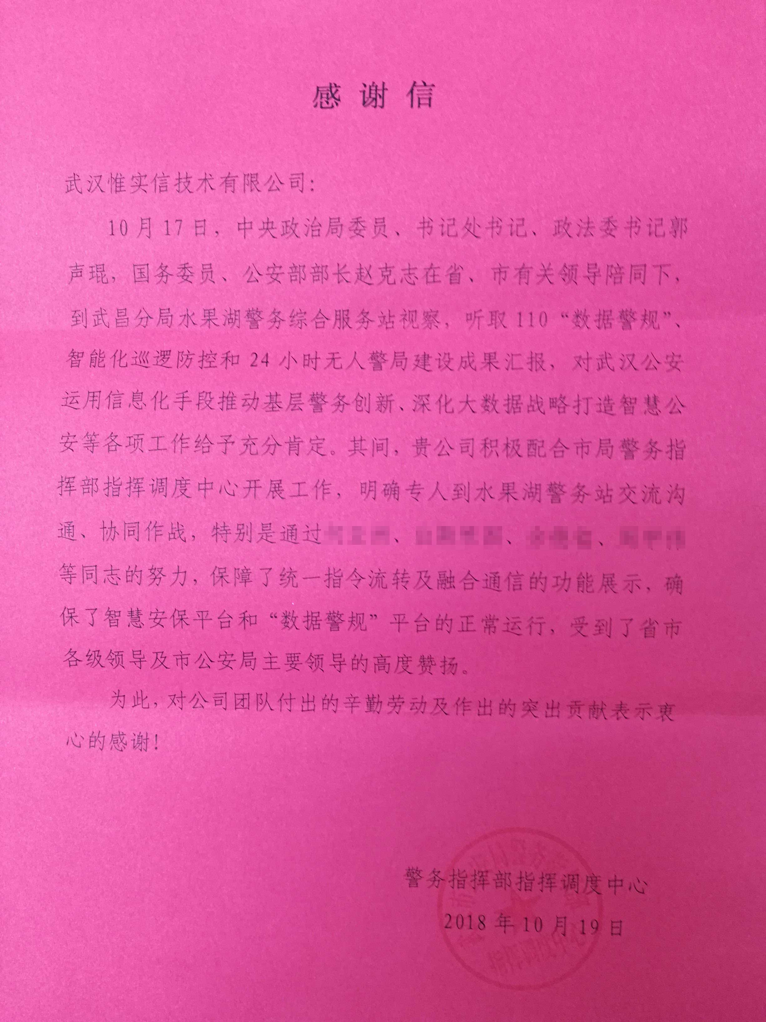 為此,武漢市公安局警務(wù)指揮部指揮調(diào)度中心對(duì)我公司團(tuán)隊(duì)付出的辛勤勞動(dòng)及作出的突出貢獻(xiàn)表示衷心的感謝。